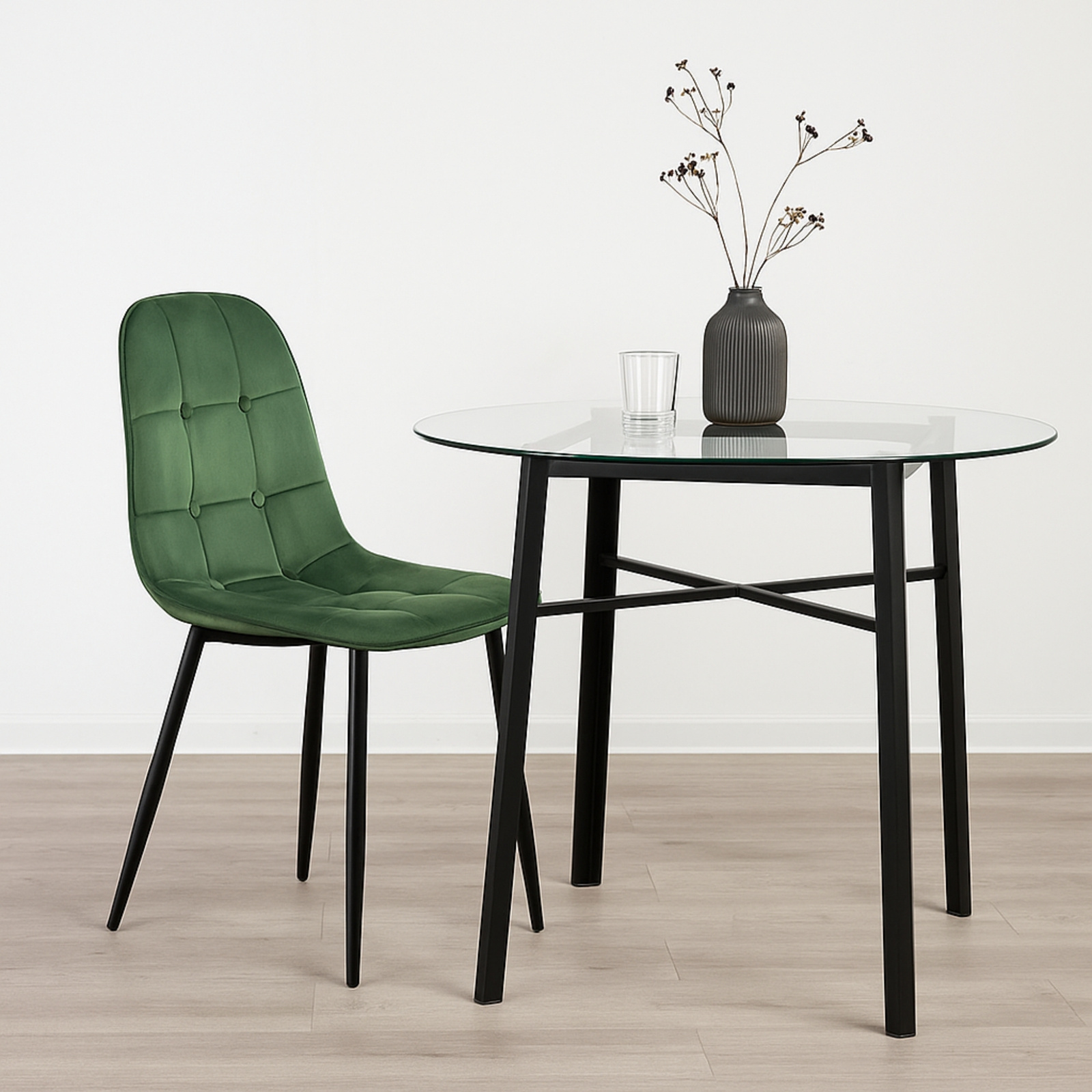 L’assise et le dossier profilés, recouverts d’un tissu velvet doux au toucher, assurent un confort optimal, que ce soit pour les repas quotidiens ou pour de longues heures passées à table. Les pieds hauts et fins donnent à la structure une sensation de légèreté tout en garantissant sa stabilité.