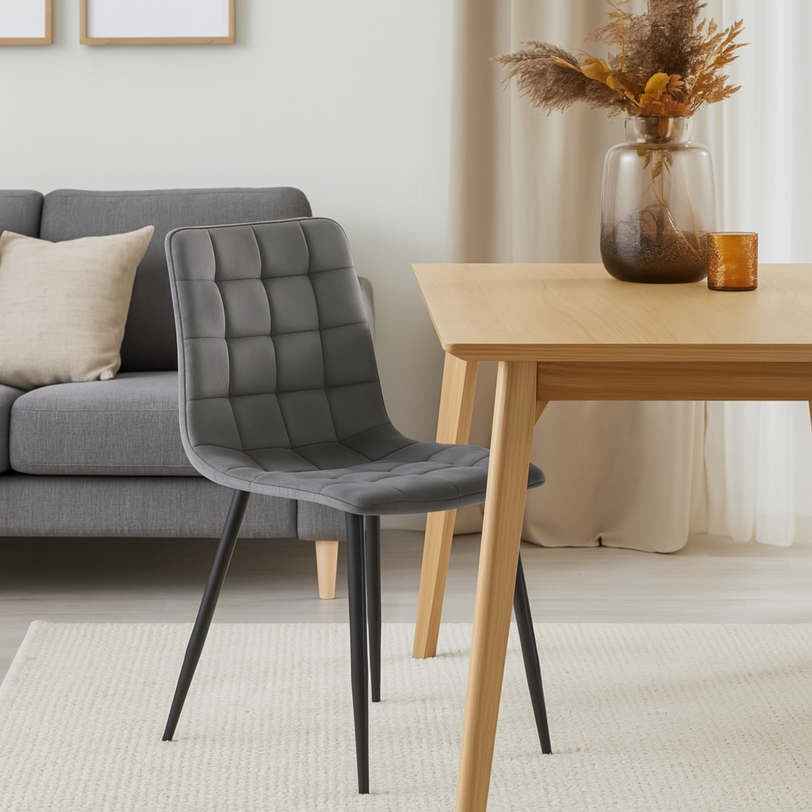 La chaise capitonnée avec un tissu velours doux au toucher et des pieds métalliques noirs, hauts et fins, allie élégance et caractère loft. Les coutures matelassées caractéristiques soulignent le style élégant et rehaussent l’esthétique, rendant ce meuble minimaliste plus attrayant. Son design universel permet une intégration parfaite dans les espaces domestiques – cuisine, salle à manger, salon – mais aussi dans les espaces commerciaux – bureau, salle de réunion ou salle d’attente – où le style et le confort sont essentiels.