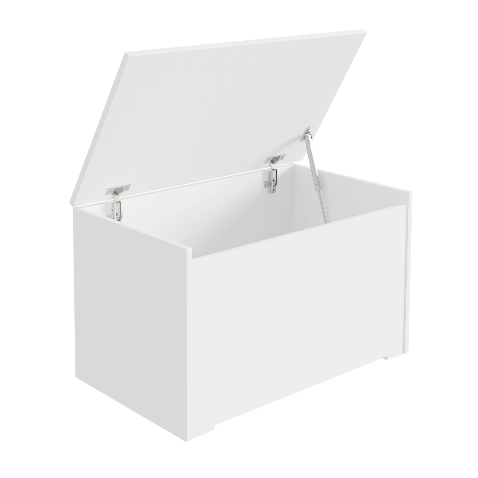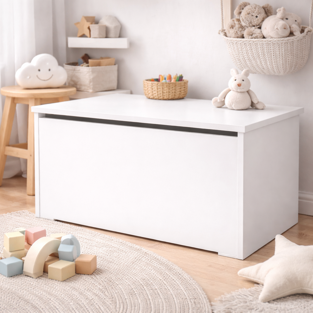 Le coffre se distingue par une fabrication soignée et une attention particulière portée à chaque détail. Il est fabriqué en panneau de meuble stratifié double face, ce qui garantit sa robustesse et sa résistance aux rayures. Le couvercle s’ouvre vers le haut grâce à un vérin à gaz. L’intérieur offre beaucoup d’espace pour des objets de tailles variées. La couleur blanche facilite son intégration dans divers décors. Grâce au coffre à jouets, ranger la chambre devient un jeu d’enfant.
