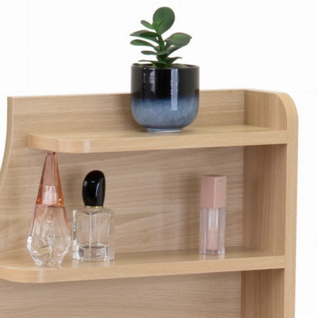 La coiffeuse est également équipée d'étagères pratiques qui offrent un espace de rangement supplémentaire. Vous pouvez y placer vos produits cosmétiques, livres ou décorations préférés, ce qui ajoutera du charme à votre coin beauté.