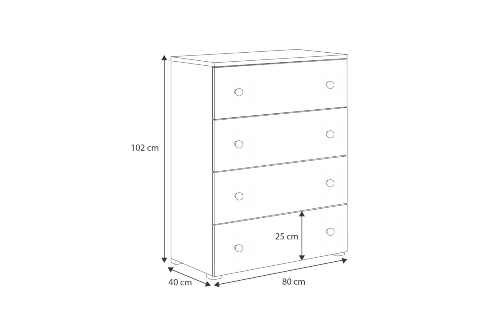 Le modèle EMILY GOAL est équipé de quatre tiroirs spacieux montés sur des glissières à billes avec blocage, assurant une ouverture silencieuse et fluide ainsi qu’une utilisation en toute sécurité. Les tiroirs permettent de ranger facilement vêtements, jouets et accessoires. Les pieds en plastique de 2 cm de hauteur garantissent la stabilité, tandis que le dispositif d’ancrage mural inclus apporte une sécurité supplémentaire en évitant tout basculement accidentel du meuble.