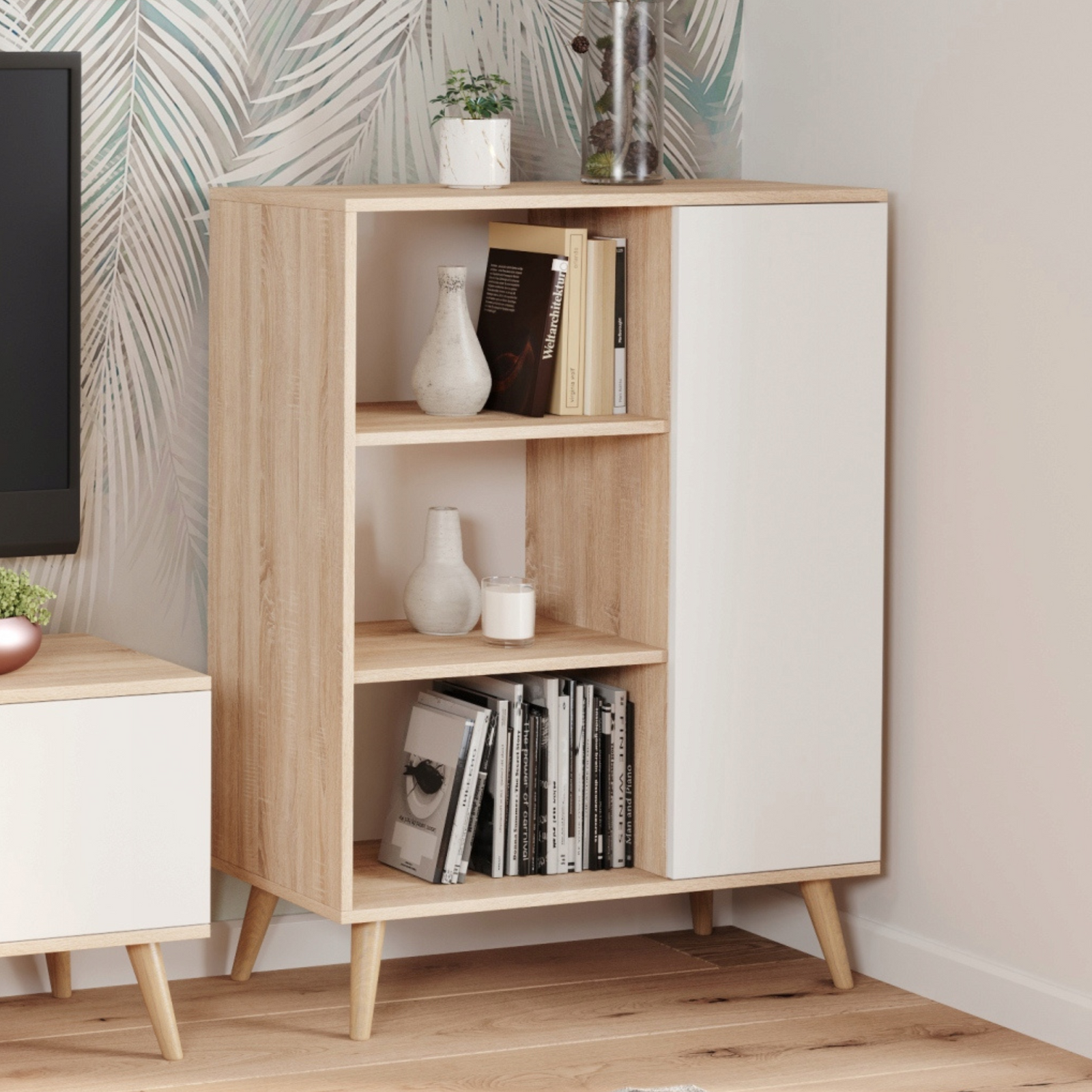 Commode FONDI armoire avec étagère, style scandinave, pieds en bois - Chêne Sonoma / Blanc