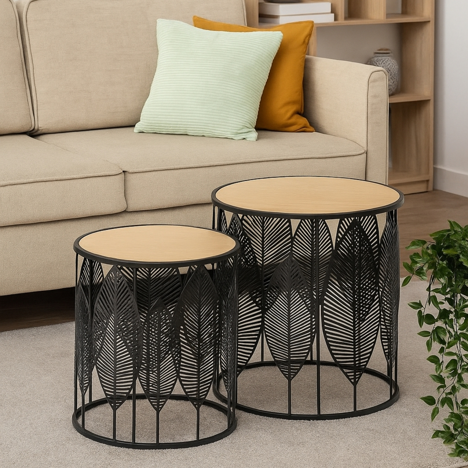 Les plateaux sont fabriqués en panneau MDF de haute qualité, recouverts d’un placage naturel qui apporte chaleur à l’ensemble. La structure métallique robuste est peinte par poudrage, ce qui garantit une surface lisse et résistante aux rayures. Le piètement ajouré orné d’un motif feuillage est à la fois solide et visuellement léger. Une combinaison de style et de robustesse, parfaite pour un usage quotidien.
