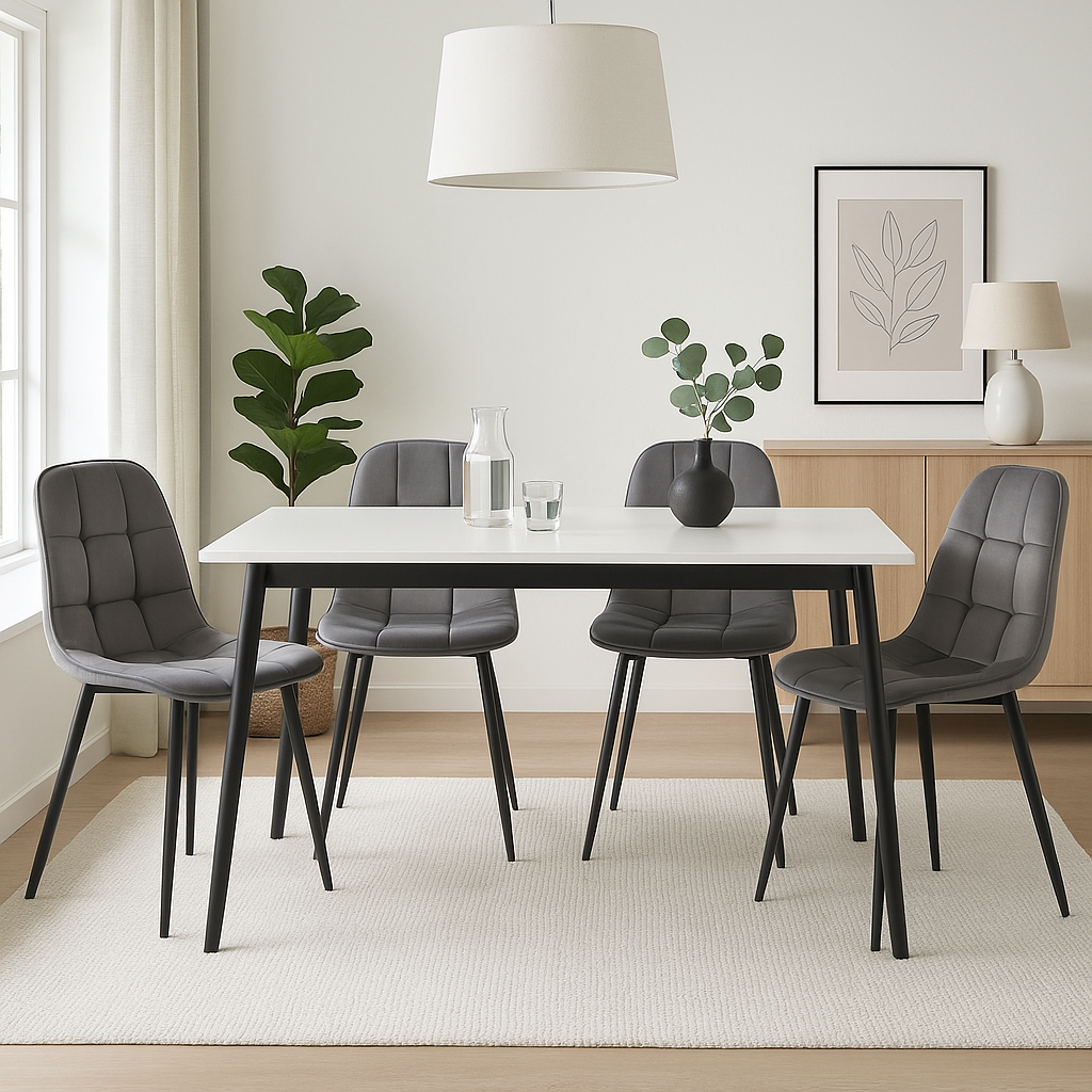 L’assise et le dossier profilés, recouverts d’un tissu velvet doux au toucher, assurent un confort optimal, que ce soit pour les repas quotidiens ou pour de longues heures passées à table. Les pieds hauts et fins donnent à la structure une sensation de légèreté tout en garantissant sa stabilité.