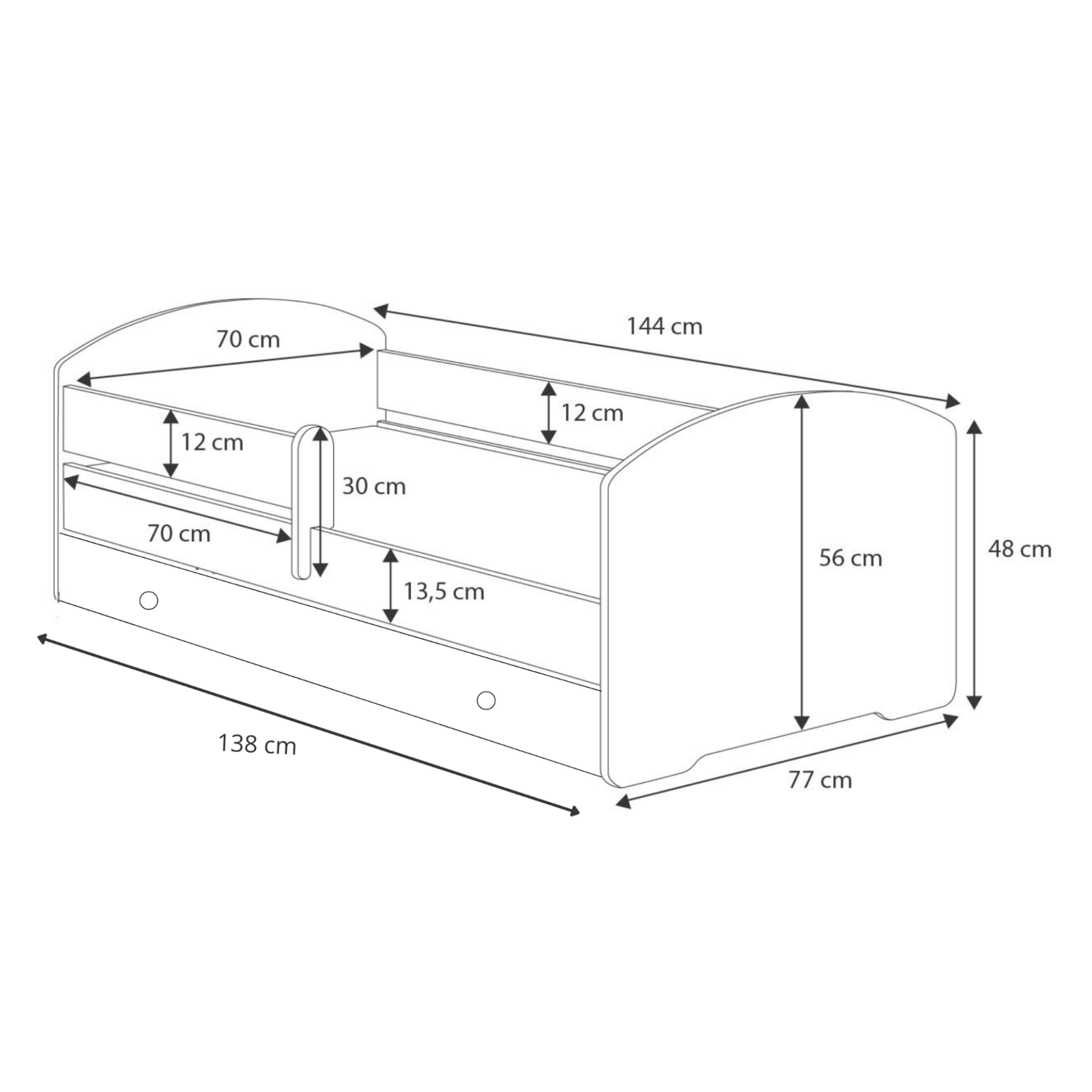 • • Lit: 144 cm x 77 cm x 56 cm