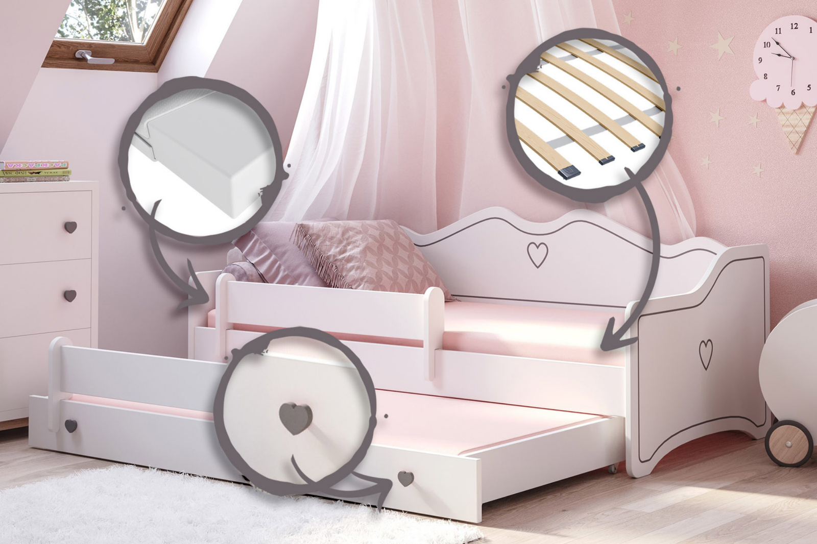 Le lit pour enfant EMMA II est un meuble qui offre confort, sécurité et fonctionnalité. Son design à la fois original et minimaliste permet au lit de s’intégrer facilement dans différents styles de décoration et d’embellir la chambre d’une fille. Les jolis détails tels que les graphismes et les poignées en forme de cœur ajoutent du caractère. Lors du choix du modèle EMMA II, il convient de prendre en compte son aspect pratique. L’un des atouts du lit est sa forme – l’arrière et les côtés sont suffisamment hauts, ce qui permet au lit de faire office de canapé pendant la journée, offrant un endroit confortable pour s’asseoir et s’appuyer. Grâce à son niveau inférieur escamotable, un lit simple se transforme facilement en lit double, optimisant ainsi l’espace – idéal pour les frères et sœurs ou les invités.