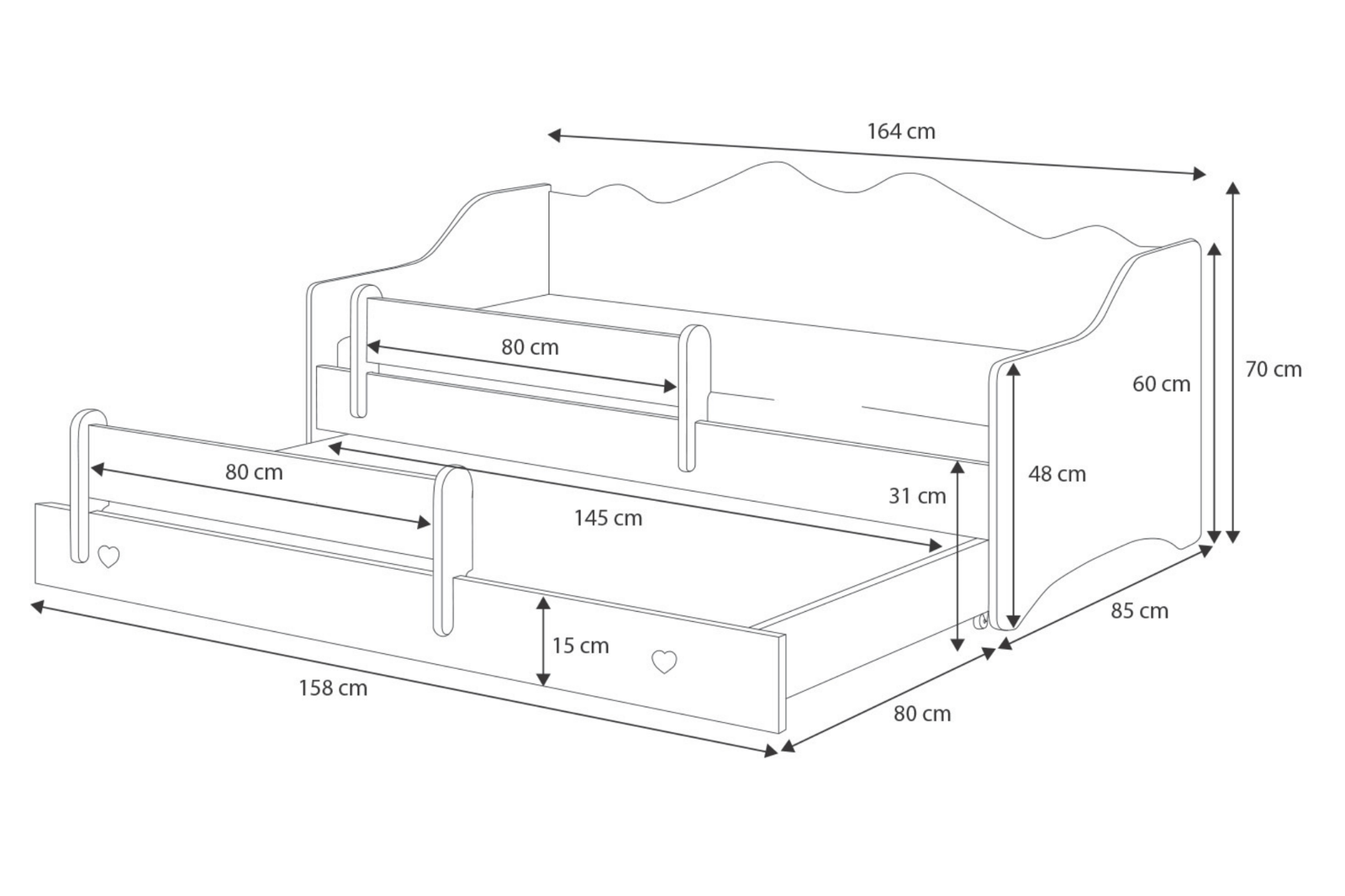 Le lit pour enfant EMMA II est un meuble qui offre confort, sécurité et fonctionnalité. Son design à la fois original et minimaliste permet au lit de s’intégrer facilement dans différents styles de décoration et d’embellir la chambre d’une fille. Les jolis détails tels que les graphismes et les poignées en forme de cœur ajoutent du caractère. Lors du choix du modèle EMMA II, il convient de prendre en compte son aspect pratique. L’un des atouts du lit est sa forme – l’arrière et les côtés sont suffisamment hauts, ce qui permet au lit de faire office de canapé pendant la journée, offrant un endroit confortable pour s’asseoir et s’appuyer. Grâce à son niveau inférieur escamotable, un lit simple se transforme facilement en lit double, optimisant ainsi l’espace – idéal pour les frères et sœurs ou les invités.