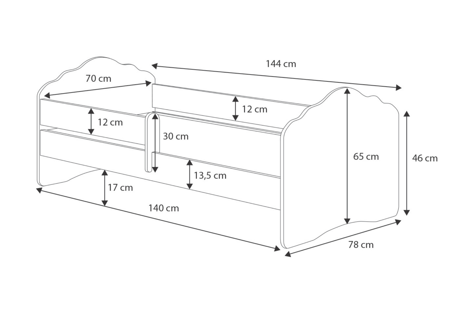 • • Lit: 144 cm x 78 cm x 65 cm