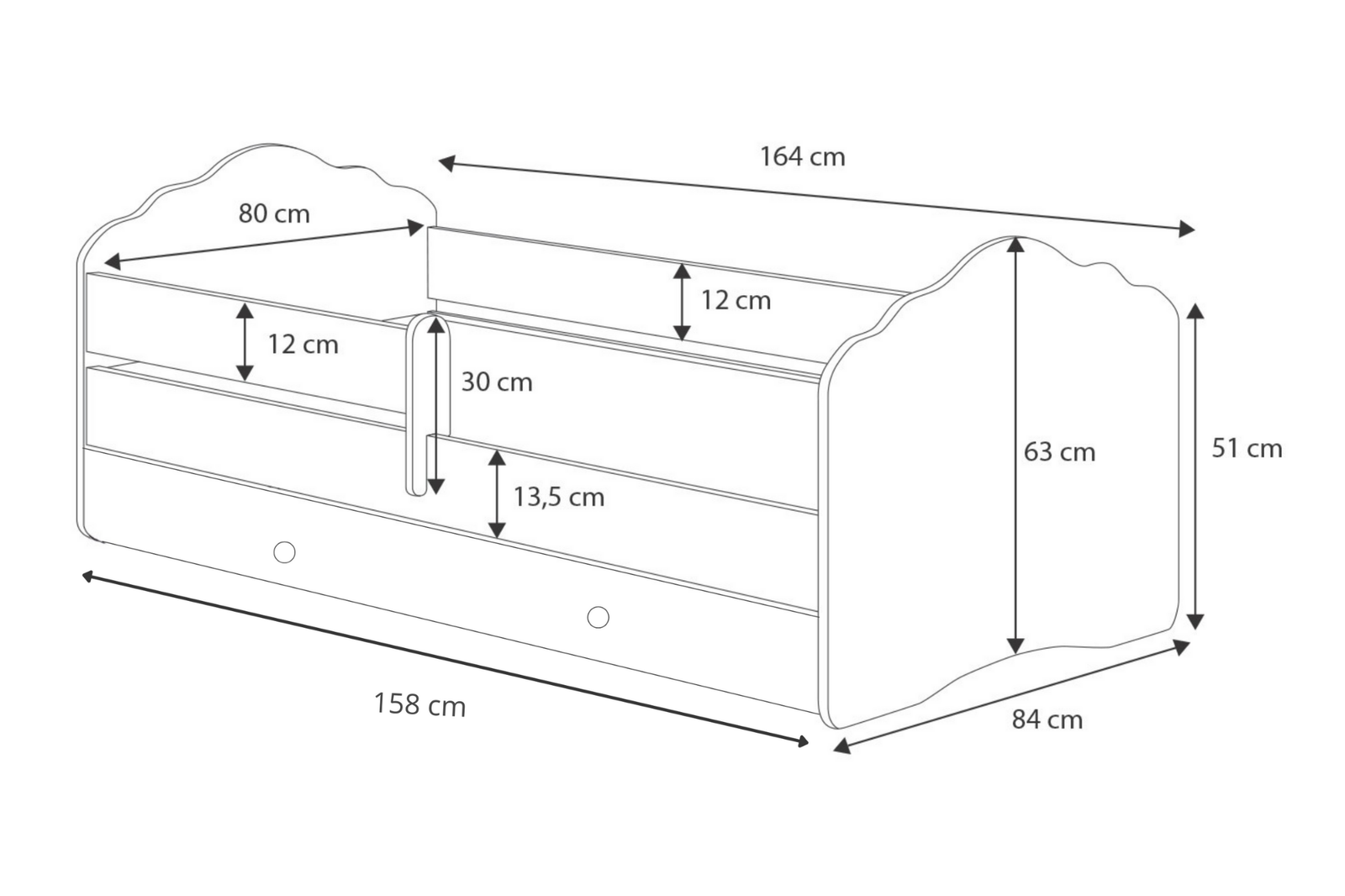 • • Lit: 164 cm x 84 cm x 63 cm