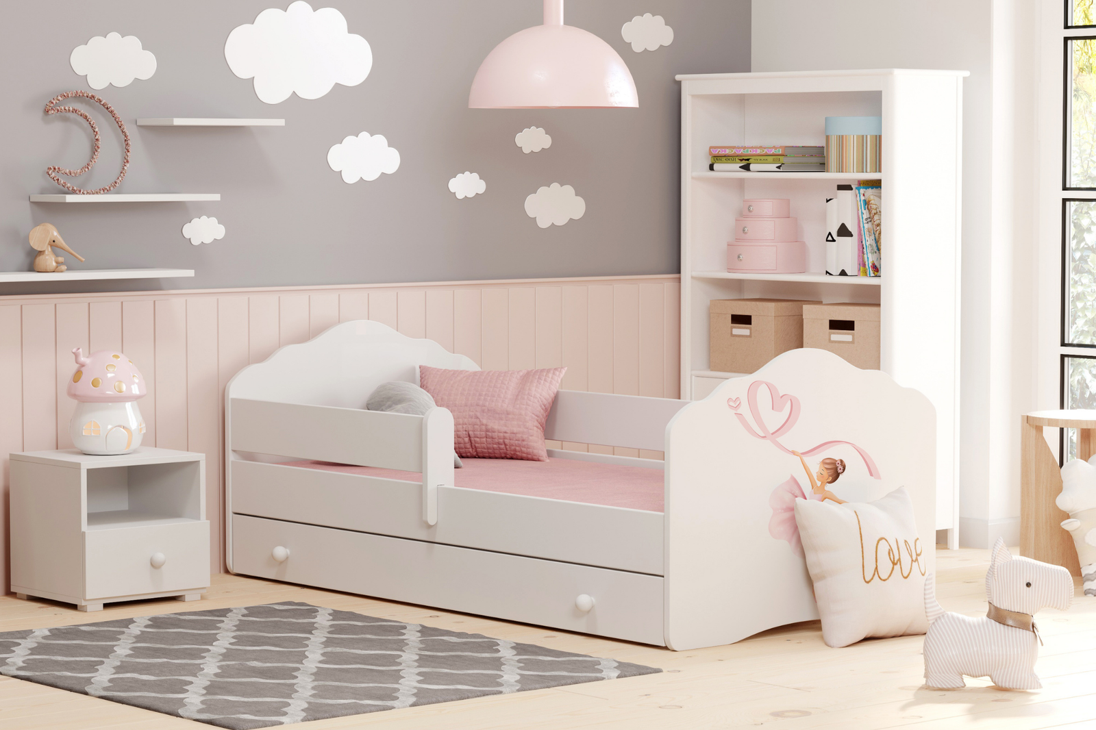 Lit enfant FALA 80x160 avec barrière, tiroir et graphisme - Ballerine