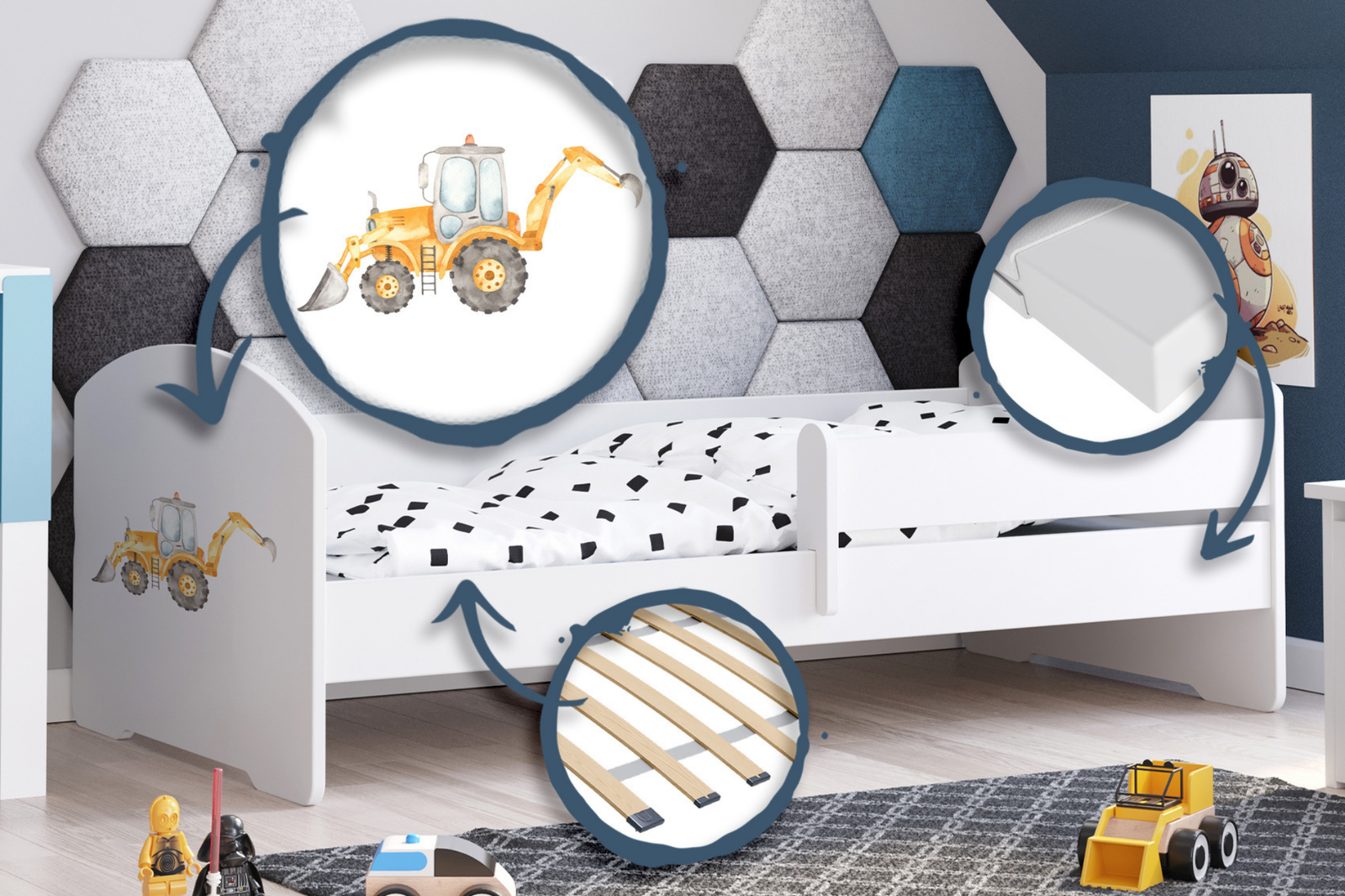 Lit enfant LUK 70x140 avec barrière graphique - Pelleteuse