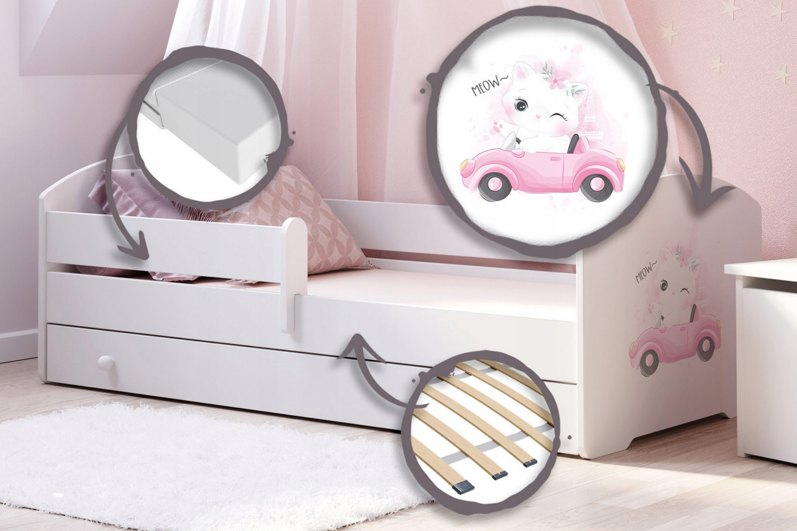 Lit enfant LUK 70x140 avec barrière, tiroir et graphique - Chat