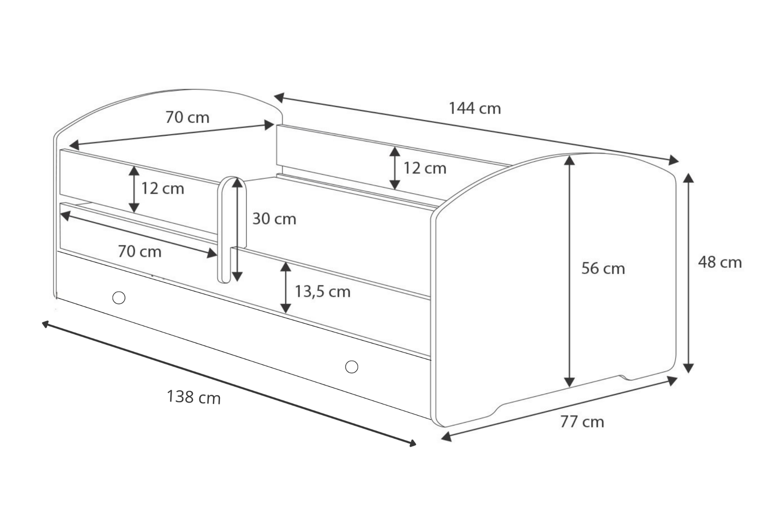 Le lit enfant LUK est un meuble qui offre confort, sécurité et fonctionnalité. Le modèle LUK est disponible en plusieurs variantes graphiques, ce qui permet de choisir un motif parfaitement adapté aux intérêts et préférences de votre enfant. Grâce à un large éventail de motifs, chaque enfant — qu’il soit passionné par le sport, les animaux ou les contes de fées — trouvera un design qui lui plaira. Ce détail graphique, à la fois minimaliste et expressif, apporte du caractère et de la gaieté à la chambre des enfants. Grâce à son design universel, ce lit convient aussi bien à une chambre de garçon qu’à celle d’une fille. En outre, il est proposé en deux tailles : 140x70 cm et 160x80 cm, ce qui permet de l’adapter facilement à l’âge et à la taille de l’enfant, ainsi qu’à l’espace disponible dans la pièce.