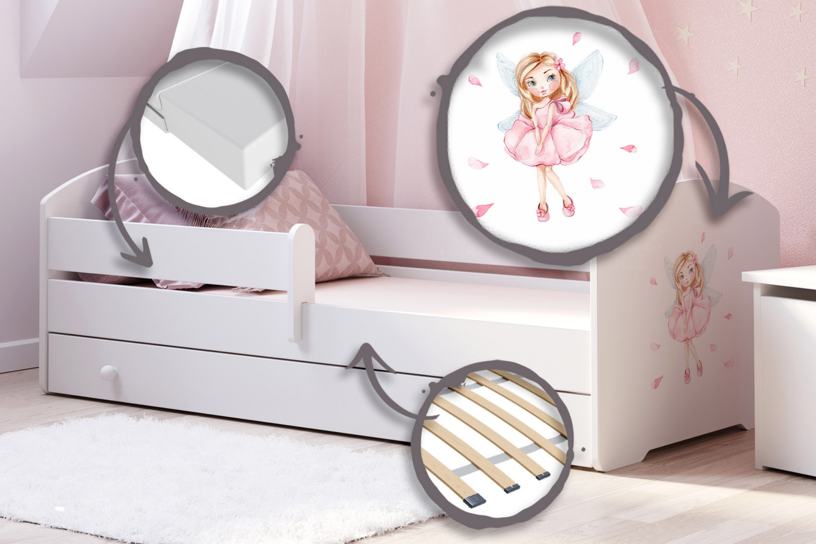 Lit enfant LUK 80x160 avec barrière, tiroir et graphique - Fillette avec des ailes