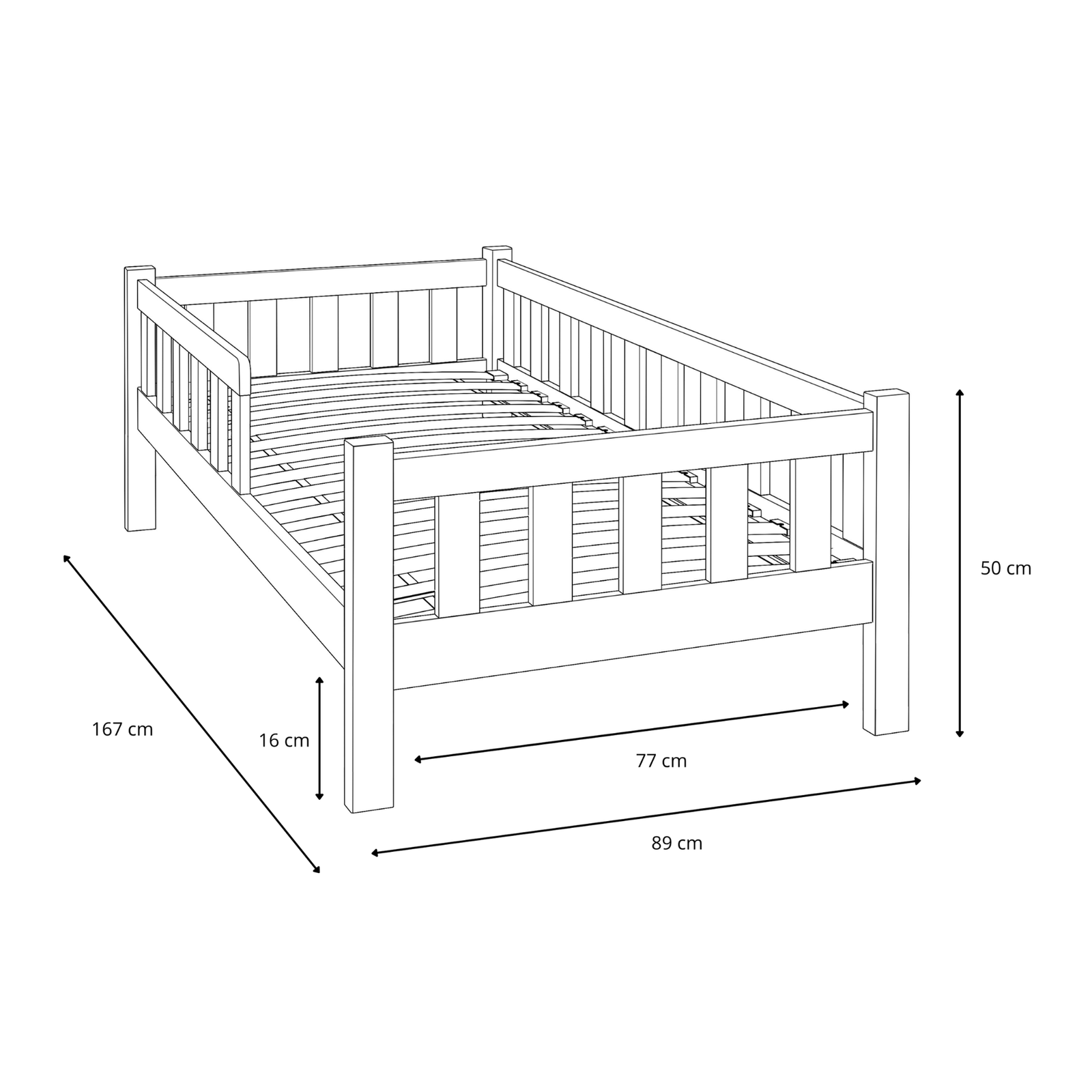 Le lit PINI est fabriqué en bois de pin de haute qualité – séché, raboté et soigneusement poncé. Sa surface naturelle non vernie est sûre pour les enfants et respectueuse de l’environnement. Tous les bords et coins sont délicatement arrondis pour plus de sécurité. Le sommier à lattes flexibles en bouleau, de type FLEX, assure un bon soutien du matelas et un excellent confort de sommeil. Le meuble est conçu pour être monté soi-même, et certaines pièces sont préassemblées pour faciliter et accélérer l’assemblage.