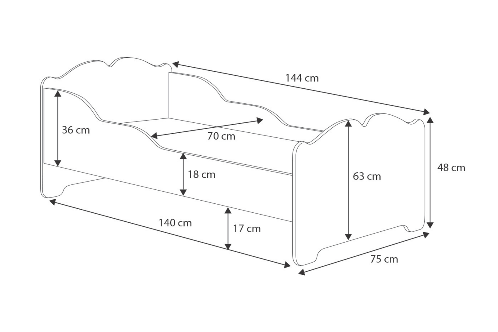 Le lit pour enfant ANNA est un meuble qui offre confort, sécurité et fonctionnalité. Grâce à son design universel, il s’intègre facilement dans différents styles d’aménagement. Ce modèle est parfait pour une chambre de fille. Le lit est proposé en deux dimensions pratiques – 70x140 cm et 80x160 cm – afin de s’adapter aux besoins d’un enfant en pleine croissance ainsi qu’à l’espace disponible. Le lit blanc avec illustration offre à l’enfant un espace sécurisé pour dormir et jouer, devenant rapidement son meuble préféré dans la chambre.