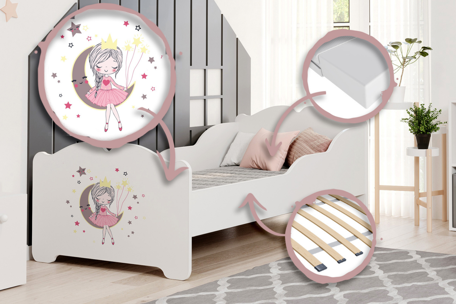 Le lit pour enfant ANNA est un meuble qui offre confort, sécurité et fonctionnalité. Grâce à son design universel, il s’intègre facilement dans différents styles d’aménagement. Ce modèle est parfait pour une chambre de fille. Le lit est proposé en deux dimensions pratiques – 80x160 cm et 70x140 cm – afin de s’adapter aux besoins d’un enfant en pleine croissance ainsi qu’à l’espace disponible. Le lit blanc avec illustration offre à l’enfant un espace sécurisé pour dormir et jouer, devenant rapidement son meuble préféré dans la chambre.