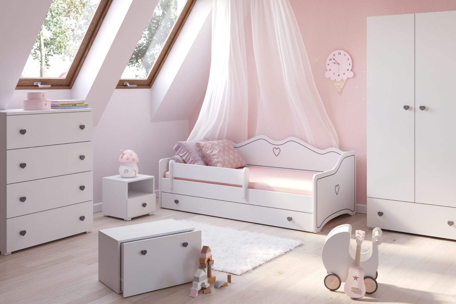 • Le lit pour enfant EMMA avec barrière, tiroir, illustration colorée et poignées en forme de cœur est un meuble aussi beau que fonctionnel, idéal pour la chambre d’une fille.