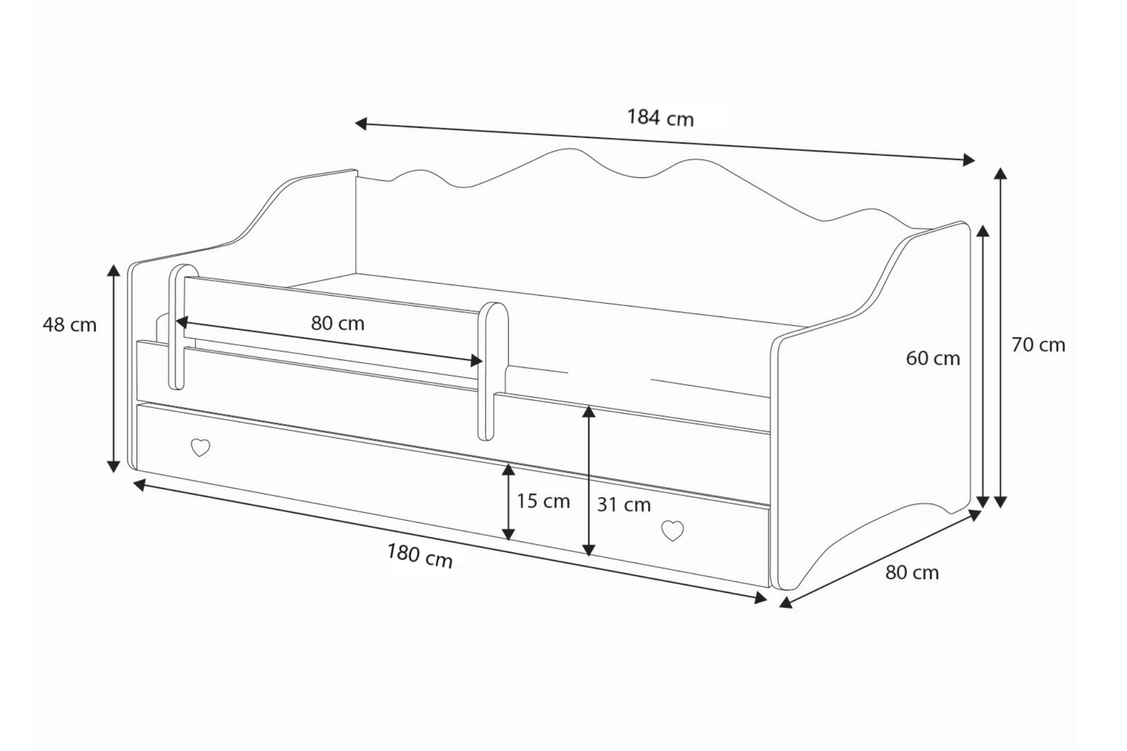 Le lit pour enfant EMMA est un meuble alliant confort, sécurité et fonctionnalité. Son design à la fois original et minimaliste permet de l’intégrer facilement dans différents styles d’aménagement et d’embellir la chambre d’une fille. Les jolis détails comme l’illustration et les poignées en forme de cœur lui donnent un charme particulier. Le modèle EMMA se distingue aussi par sa praticité. La forme du lit – avec un dossier et des côtés suffisamment hauts – permet de l’utiliser également comme canapé pendant la journée, idéal pour s’asseoir confortablement et s’adosser. Ce modèle est disponible en trois dimensions pratiques – 140x70 cm, 160x80 cm et 180x80 cm – afin de s’adapter aux besoins d’un enfant en pleine croissance et à l’espace disponible dans la chambre.