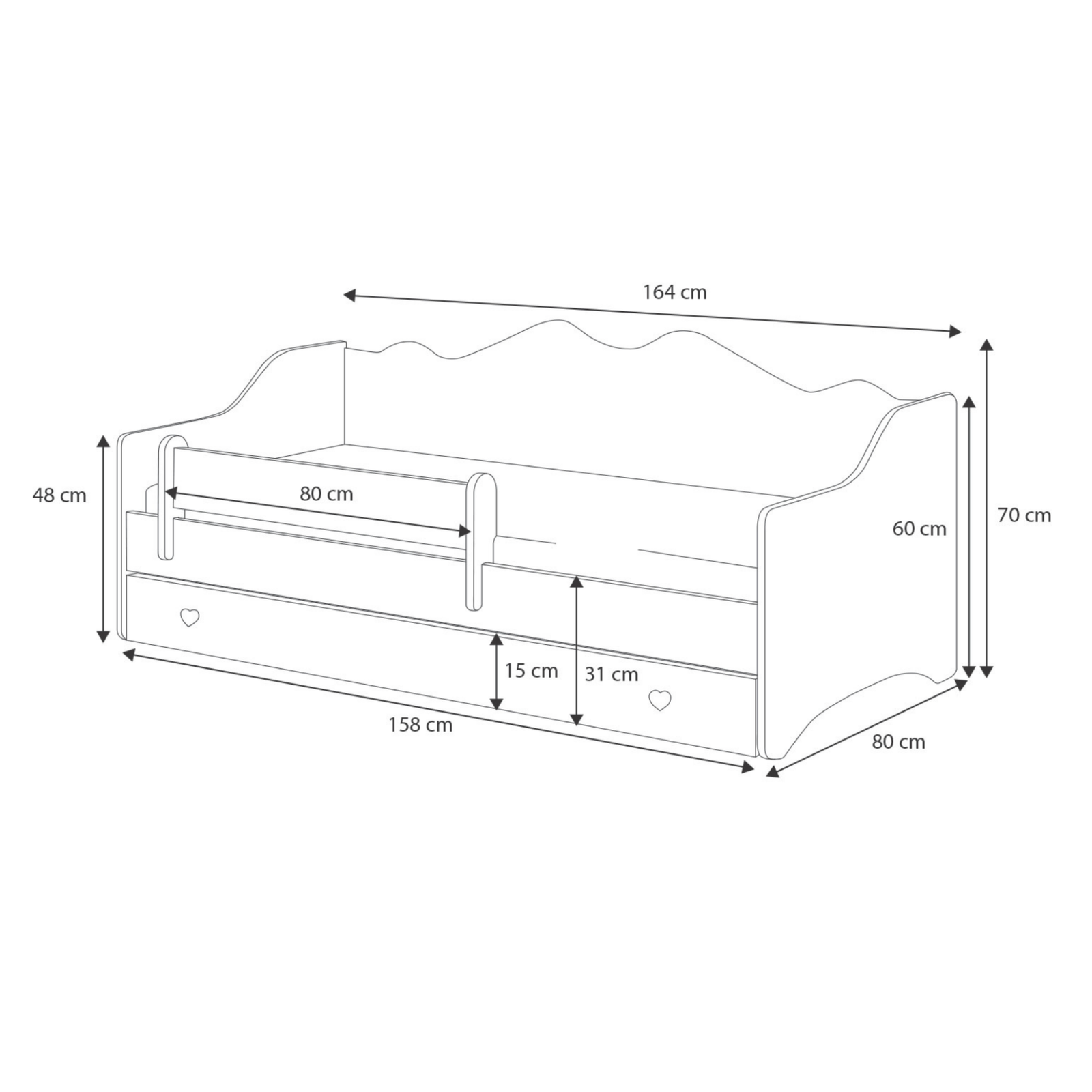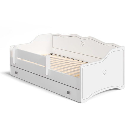 Le lit pour enfant EMMA est un meuble offrant confort, sécurité et fonctionnalité. Son design à la fois original et minimaliste permet au lit de s’intégrer facilement dans différents styles d’aménagement et d’embellir la chambre d’une petite fille. Les jolis détails tels que la décoration et les poignées en forme de cœur ajoutent du caractère. Lors du choix du modèle EMMA, il est important de prendre en compte sa praticité. L’un des avantages du lit est sa forme – aussi bien l’arrière que les côtés sont suffisamment hauts, ce qui permet au lit de servir de canapé pendant la journée, idéal pour s’asseoir et s’appuyer confortablement. Ce modèle de lit est disponible en trois dimensions pratiques – 140x70 cm, 160x80 cm et 180x80 cm – afin de l’adapter au mieux aux besoins d’un enfant en pleine croissance et à l’espace disponible dans la chambre.
