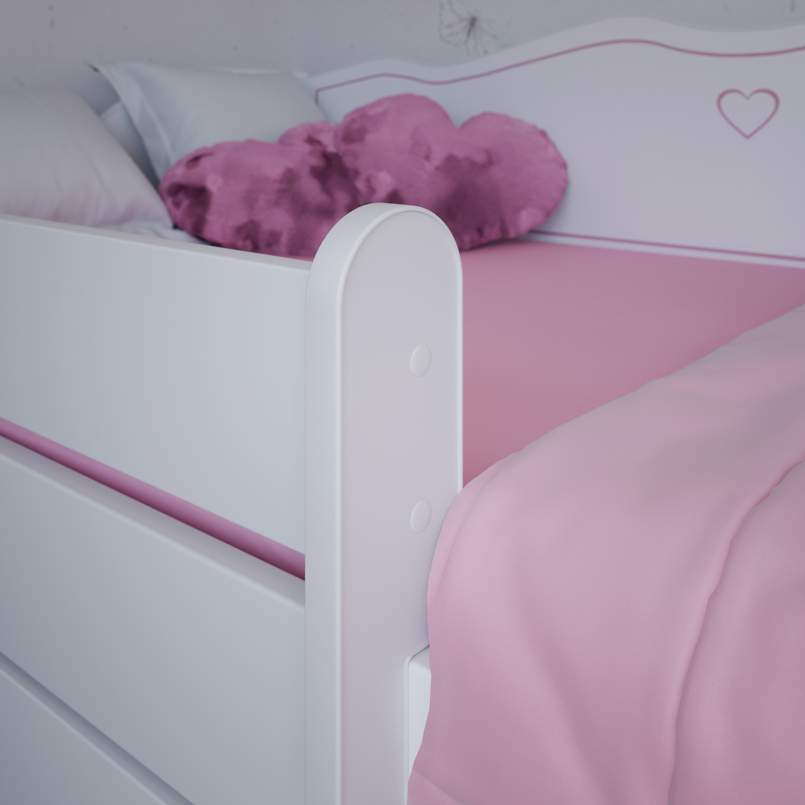 Le lit EMMA a été conçu dans un souci d’esthétique, de fonctionnalité et de sécurité. Sa structure est fabriquée à partir de panneaux de meuble de haute qualité, assurant stabilité et solidité. Les bords légèrement arrondis, protégés par un chant en PVC, réduisent le risque de blessure. L’élément coloré sous forme d’impression est un motif UV durable et résistant à l’usure. L’ensemble comprend également une barrière de sécurité et un tiroir. Les poignées en forme de cœur assurent un confort d’ouverture du tiroir et ajoutent une touche d’élégance. Le sommier est fabriqué à partir de lattes de bouleau flexibles montées sur un système FLEX, garantissant un sommeil confortable.