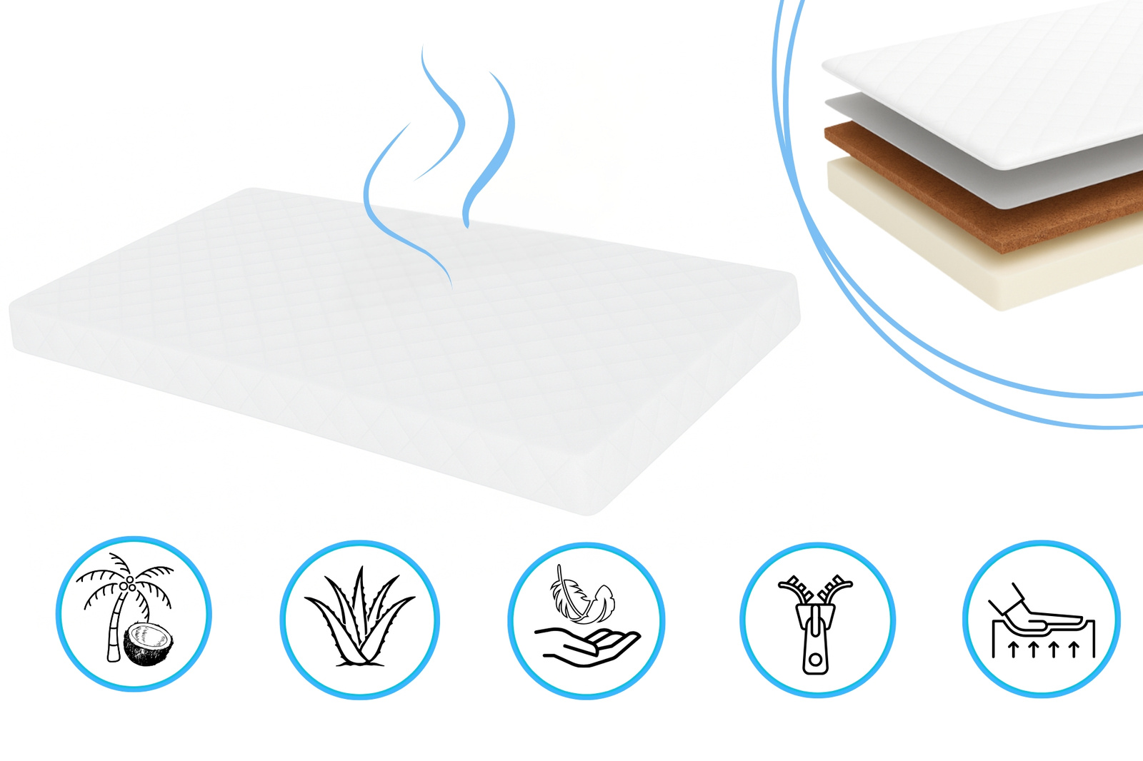 • Les matelas en mousse et en coco sont fabriqués à partir de mousse à élasticité renforcée et d'une couche de fibre de coco servant de couche de remplissage. Offrez de beaux rêves à votre enfant avec nos matelas.