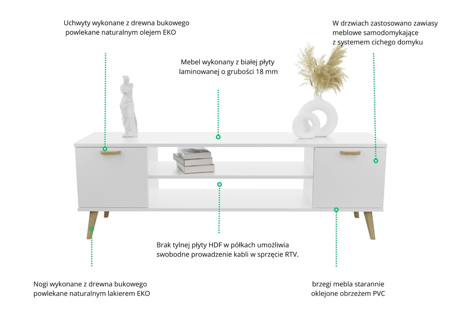 Le meuble TV FOCUS a été conçu pour un usage quotidien confortable. Sa construction simple et bien pensée permet d’optimiser le rangement des objets nécessaires dans un seul meuble, tout en maintenant l’ordre dans le salon. Le modèle FOCUS est fabriqué en panneau de meuble stratifié double face d’une épaisseur de 18 mm, ce qui lui assure une grande solidité. Tous les bords ont été soigneusement recouverts d’un chant en PVC, ce qui augmente leur durabilité et améliore l’esthétique du meuble. Les compartiments sont équipés de charnières à fermeture douce, rendant leur ouverture et fermeture agréables. Les poignées en bois de hêtre facilitent l’ouverture des portes. Le meuble est également doté de pieds fins en bois de hêtre d’une hauteur de 15 cm, assurant une bonne circulation de l’air sous le meuble et facilitant le ménage. Étant donné que les poignées et les pieds sont fabriqués en bois de hêtre, ils peuvent présenter de légères différences de teinte. L’un des atouts du meuble FOCUS est sa solidité combinée à une structure légère, ce qui permet de le déplacer facilement. Le meuble TV FOCUS est adapté aux téléviseurs de 32 à 55 pouces.
