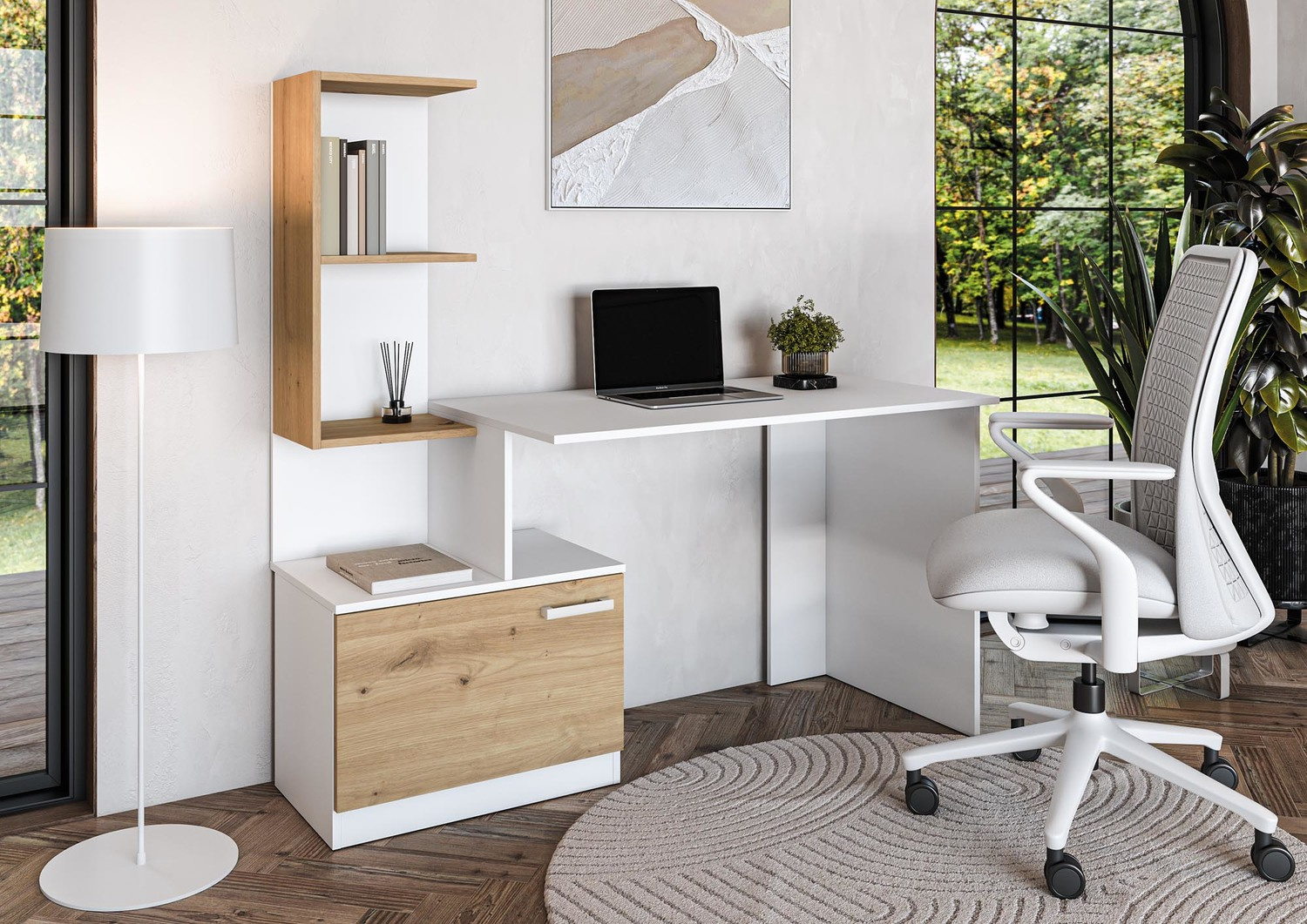 Le large plateau permet de travailler confortablement au bureau. Sa grande surface permet de disposer facilement une lampe, un ordinateur ou un ordinateur portable, ainsi que des cahiers ou des documents. La conception du meuble rend ce bureau parfaitement adapté pour ranger les objets nécessaires au travail, à l'étude ou au jeu, afin de les garder toujours à portée de main. L’armoire fermée offre un espace de rangement supplémentaire pour les objets que l’on souhaite garder hors de vue, tout en restant accessibles. L’espace adéquat sous le plateau permet le choix de n’importe quelle chaise sans restreindre les mouvements, assurant un confort optimal.