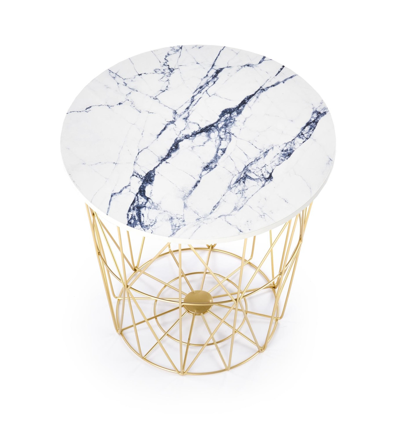 La table est fabriquée à partir de matériaux de haute qualité. Le plateau rond est en MDF recouvert d’un placage à motif marbre avec une finition mate, ce qui s’harmonise parfaitement avec la structure métallique peinte par poudrage. La forme ronde apporte de la légèreté, tandis que la structure dorée souligne le caractère luxueux du meuble. C’est une table exceptionnelle qui apportera élégance et raffinement à votre intérieur. Grâce à sa conception bien pensée, elle est non seulement fonctionnelle, mais aussi solide et stable.